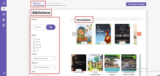 Una vez en la Biblioteca, aparecerán diferentes opciones de filtros. El primero es un buscador, en el cual podrás escribir el título del libro de tu preferencia. Los siguientes filtros permiten una búsqueda por edad del estudiante, tema, género y país del autor.
