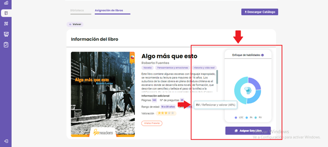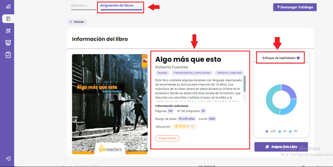 Adicionalmente, en el recuadro de Enfoque de habilidades, observarás el porcentaje de habilidades que aborda el libro al pasar el cursor por cada segmento del gráfico. Es importante considerar estos detalles para tener la certeza de asignar el libro más conveniente para tu clase.