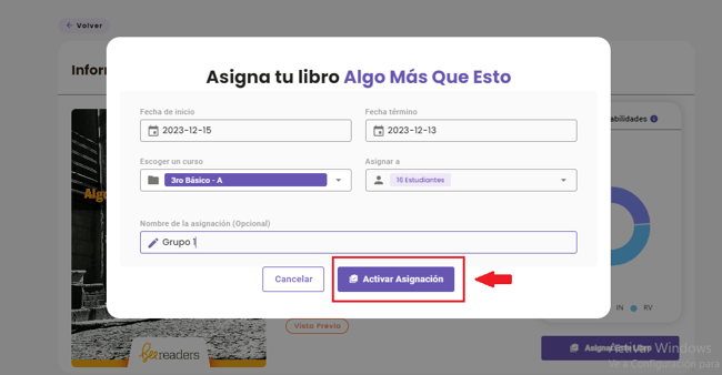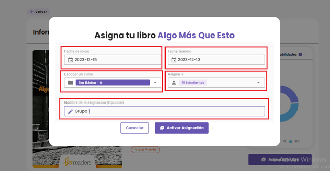 - También existe la alternativa de poner un nombre a la asignación, lo cual es útil si asignaste el libro a determinados grupos y no a toda la clase.