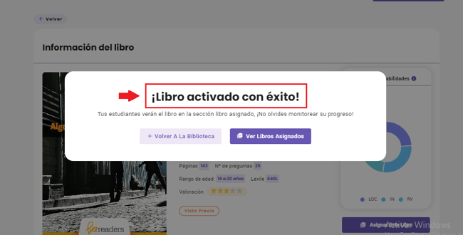 Inmediatamente después aparecerá este mensaje de confirmación de la asignación realizada: Libro activado con éxito. En ese mismo recuadro tendrás la opción de Volver a la biblioteca o de Ver libros asignados.