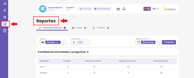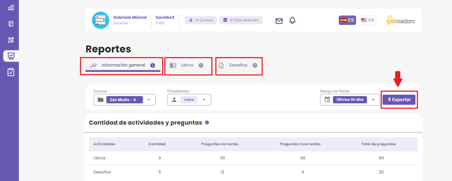 Selecciona el reporte que deseas revisar, ya sea la pestaña Información general, Libros o Desafíos. Luego, ubica el botón Exportar y haz clic.