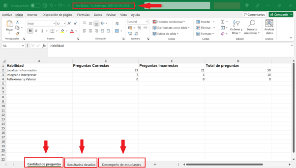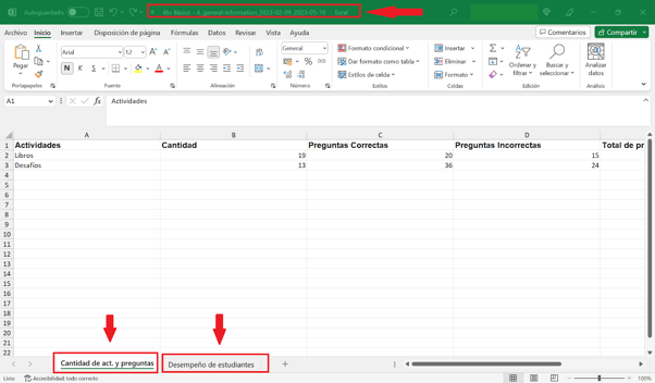 Por último, presentamos una imagen referencial de la vista en formato Excel de un reporte de desafíos con sus respectivas pestañas: