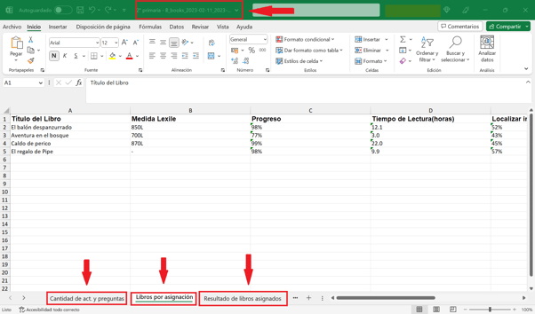Incluimos también una imagen referencial de la vista en formato Excel de un reporte de libros con sus respectivas pestañas: