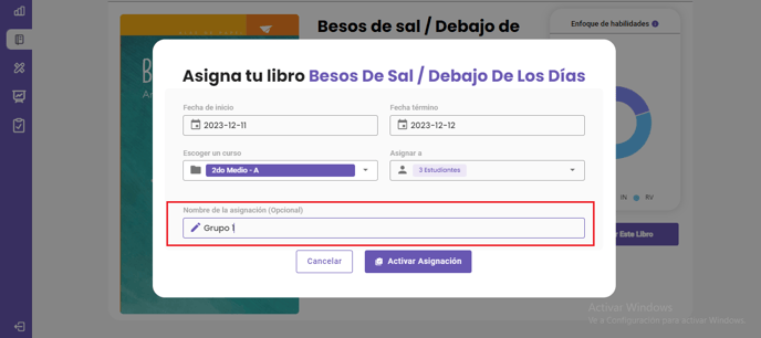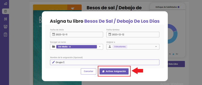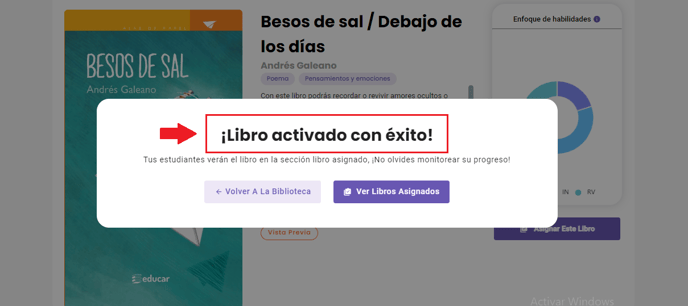 Inmediatamente, verás un mensaje que confirma la asignación realizada: Libro activado con éxito.
