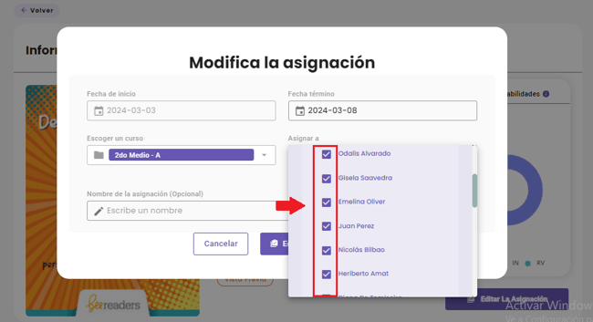 - Si posterior a la asignación del libro, se incorporan nuevos estudiantes al curso, deberás editar la asignación para incluirlos. Descubre cómo editar la asignación en este enlace 👉¿Cómo añadir o retirar alumnos de una asignación?