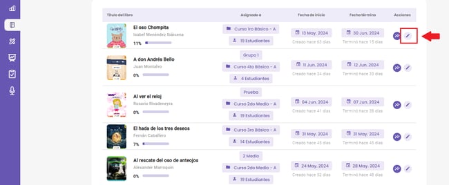 Ubica el libro que deseas modificar y haz clic en el Ãcono de lápiz.