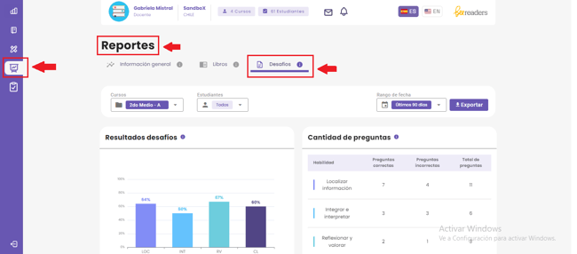 La pestaña Desafíos, ubicada en la sección Reportes, muestra los resultados alcanzados por tus estudiantes en los desafíos realizados.