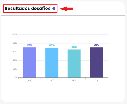1. Resultados desafíos: El gráfico de barras muestra los porcentajes de logro en las habilidades lectoras (localizar información [LOC], integrar e interpretar [INT], y reflexionar y valorar [RV]) y el porcentaje de logro de la compresión lectora (CL) en los desafíos realizados. Puedes ver el gráfico por curso o por estudiante.
