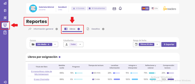 La pestaña Libros, ubicada en la sección Reportes, muestra los resultados de tus estudiantes con respecto a la lectura de los libros asignados; además, incluye la lista de aquellos estudiantes que han leÃdo por gusto propio.