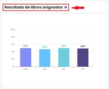 2. Resultados de libros asignados: El gráfico de barras muestra los porcentajes de logro en las habilidades lectoras (LOC, INT, RV) y en la compresión lectora (CL) de los libros asignados. Puedes ver el gráfico por curso o por estudiante.