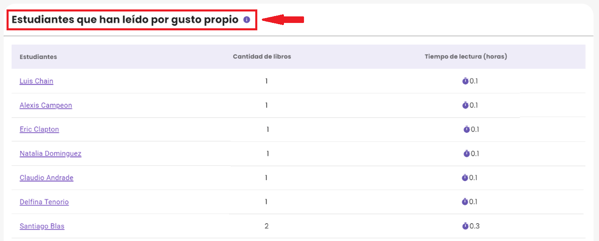 4. Estudiantes que han leÃdo por gusto propio: Si en los filtros de la parte superior seleccionaste una determinada clase o nivel, la tabla mostrará a tus estudiantes y la cantidad de libros leÃdos por gusto propio de cada uno, además del tiempo invertido en ello. Si deseas conocer los tÃtulos de los libros leÃdos por cada estudiante, bastará con hacer clic sobre el nombre del alumno o alumna.