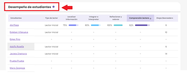 Con esta información, tendrás un panorama detallado del desempeño de tus estudiantes en las diferentes actividades que ofrece la plataforma BeeReaders.