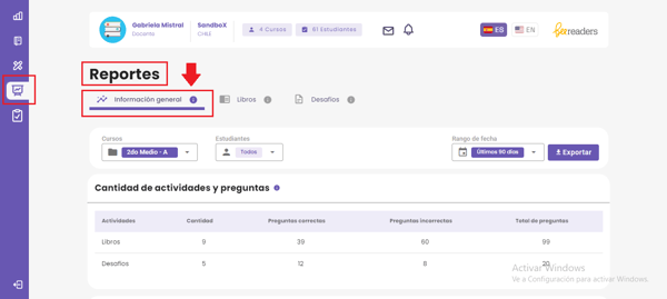 La pestaña Información general entrega los resultados obtenidos en los libros asignados, libros de gusto propio y desafíos, organizados en tablas con una amplia variedad de métricas y gráficos para una mejor interpretación de los datos. Se encuentra en la sección Reportes.