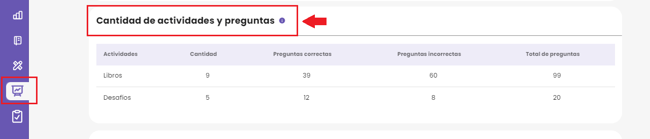 1. Cantidad de actividades y preguntas: Indica la cantidad de libros y desafíos desarrollados, detallando cuántas preguntas se respondieron correcta e incorrectamente, y el total de las mismas.
