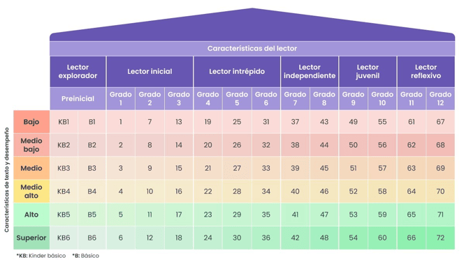 Por otro lado, para cada grado o curso, el sistema presenta una escala de seis etapas basada en las características de los textos y el desempeño de tus estudiantes. La escala va de Bajo a Superior.